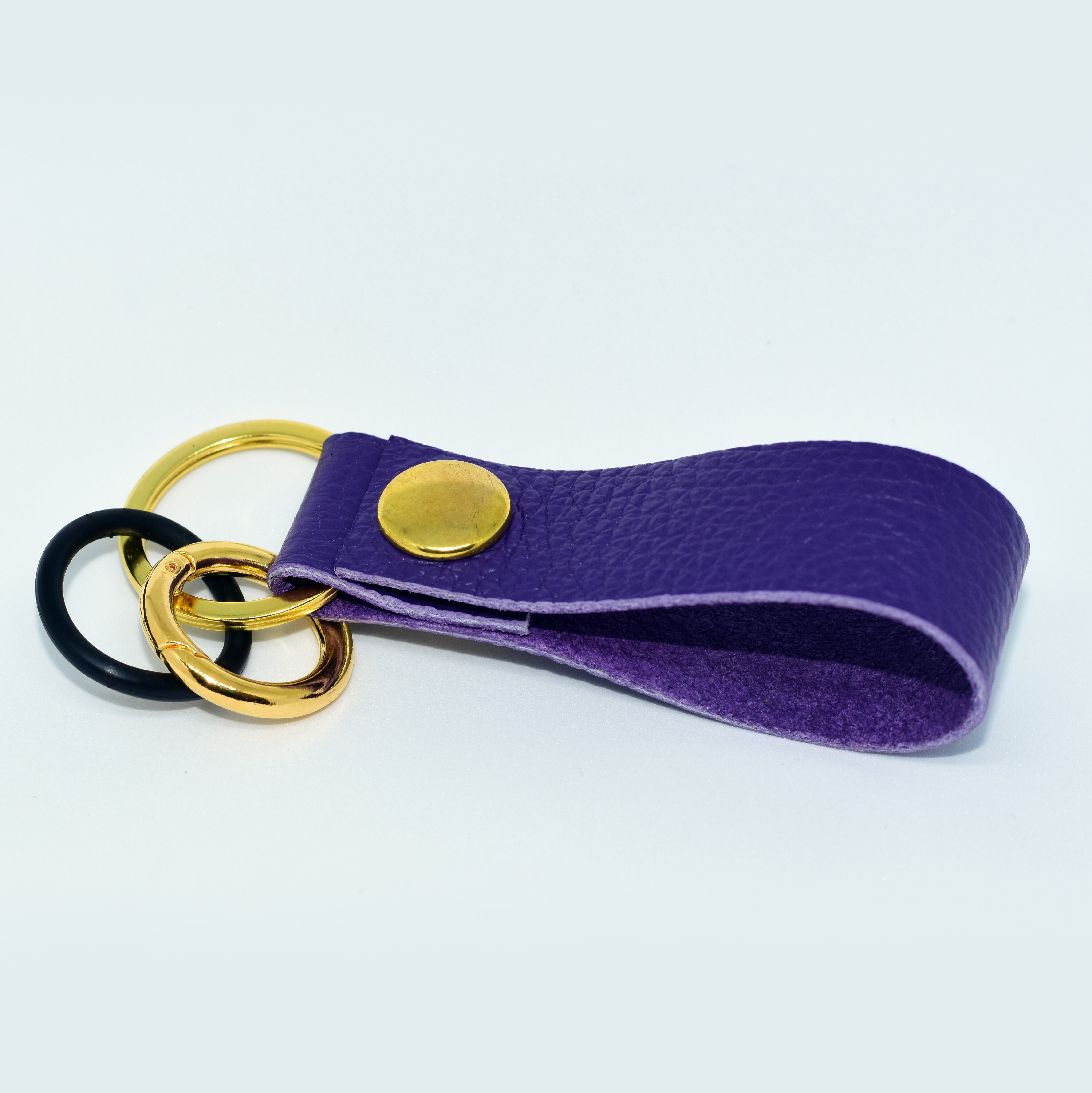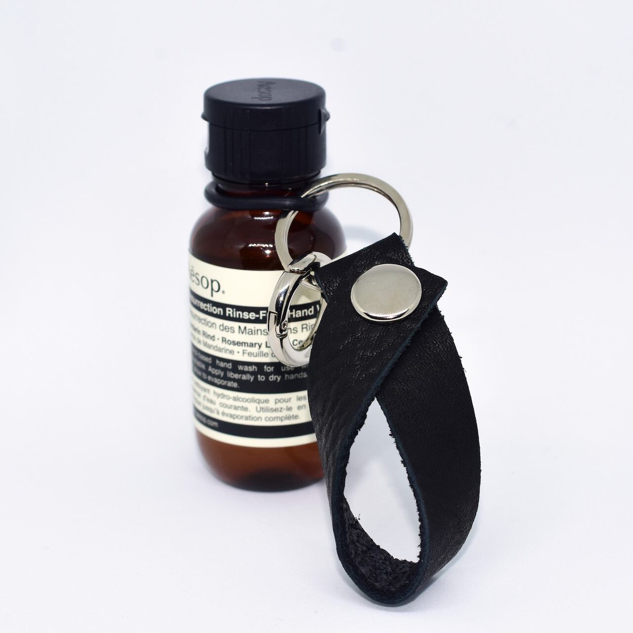 レザーストラップ部分は165mm程度(リングを含まず)の長さで仕上げており、ベルトの太いバッグやベビーカーにも取り付けが可能です。